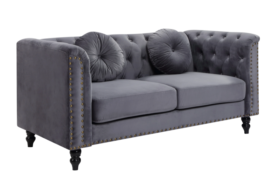 Canapés 3 places en velours TURNER – Anthracite. Forme inspirée du mythique chesterfield Coussins déco offerts Finition cloutée