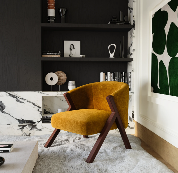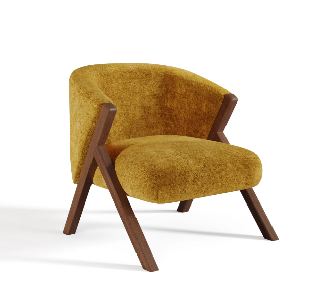 Fauteuil PLUSH velours texturé moutarde pieds walnut de la marque SIA HOME vendue 300€ au lieu de 839€. A venir chercher en magasin ou livrer chez vous pour 25€. Livraison dans toute la France 25€