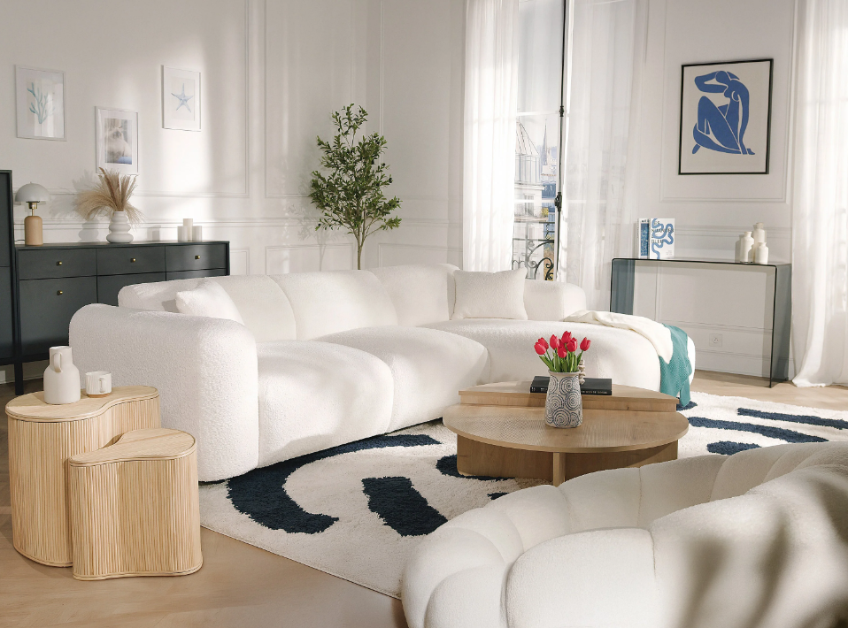 Grand canapé d’angle droit en tissu bouclette blanc POGNI de Maison Céphy
